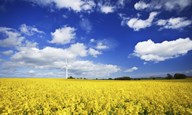 Wind turbine in a canola field against cloudy sky, Denmark