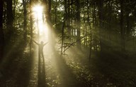 Silhouette of a man standing in the sunrays of a dark, misty forest, Denmark