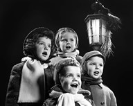 Children Singing Christmas Carols Outdoor By Lantern Light